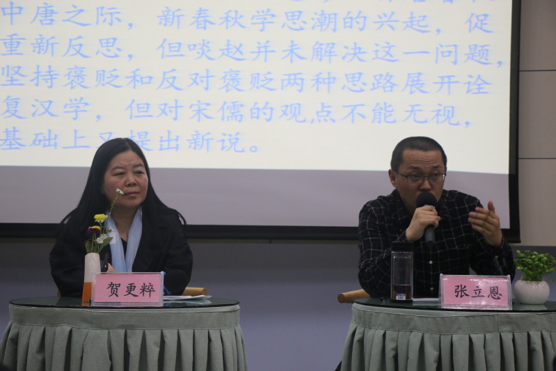 论道结尾,贺更粹老师对本场讲座进行了总结,她认为张老师的讲座让我们对孔子所著《春秋》有了一定的认识,并结合《论语》中所谓“温故而知新”阐述了研习《春秋》应有的方法以及《春秋》学的当代价值。她认为正是在温故知新的经典研习之中,经典才在不同时代开显出独具特色的时代价值,使儒学彰显出恒久的魅力,也正因此,儒学才是一个有生命力的学问。贺老师认为,从张老师的讲座中,我们可以看到儒学是一个既肯定传统又强调对传统的传承和创新的学说。