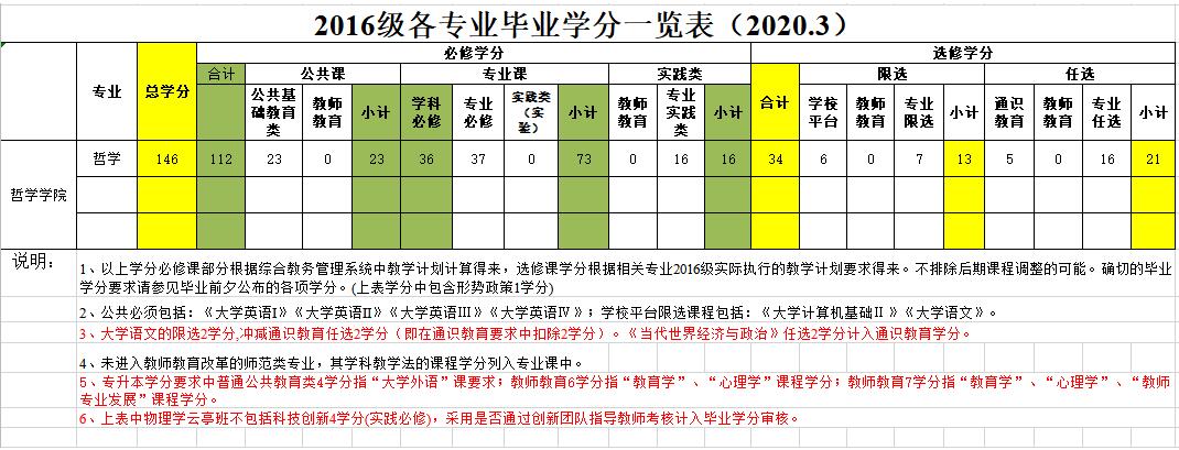 哲学学院2016级各专业毕业学分一览表