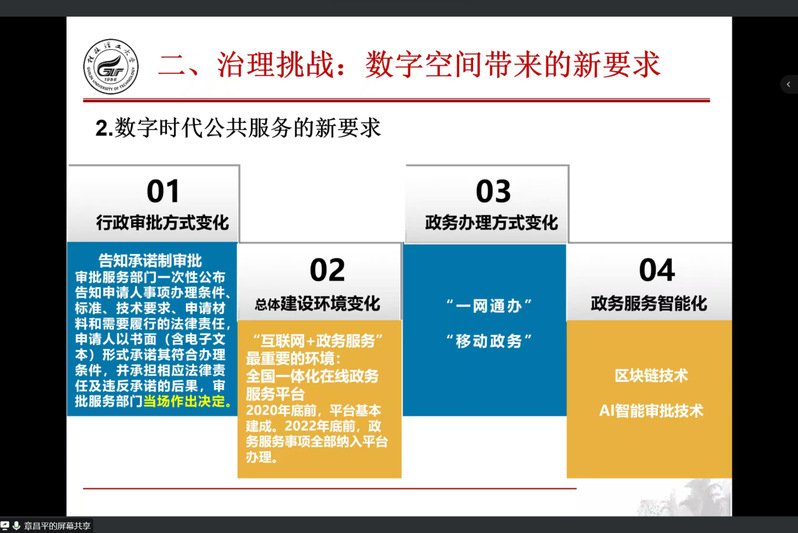 紧接着,章老师从数字空间带来的新要求指出,数字时代对我们的治理环境带来了新的挑战。这种挑战主要包括两方面内容:一方面是我们处在“一个巨变的时代,一个知识经济与VUCA叠加的时代”;另一方面是指国家能力和政府理论的变革。因此,数字时代对于公共服务和公共治理提出了新要求。
