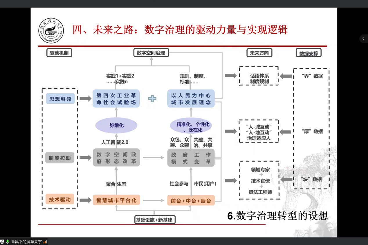 最后,章老师对数字时代的未来之路进行展望:数字治理的驱动力量与实现逻辑。主要内容包括以下几个方面:一是数字治理与数字化公共服务是新的发展阶段;二是数字治理与数字化公共服务转型的三个层次;三是要建立全新的数字治理思维;四是数字治理要达到的目标;五是数字治理与数字化公共服务转型中要注意的问题。同时,章老师还为我们生动的展示了数字治理转型设想的逻辑框架和数字空间政府形态及三元空间治理的研究体系。