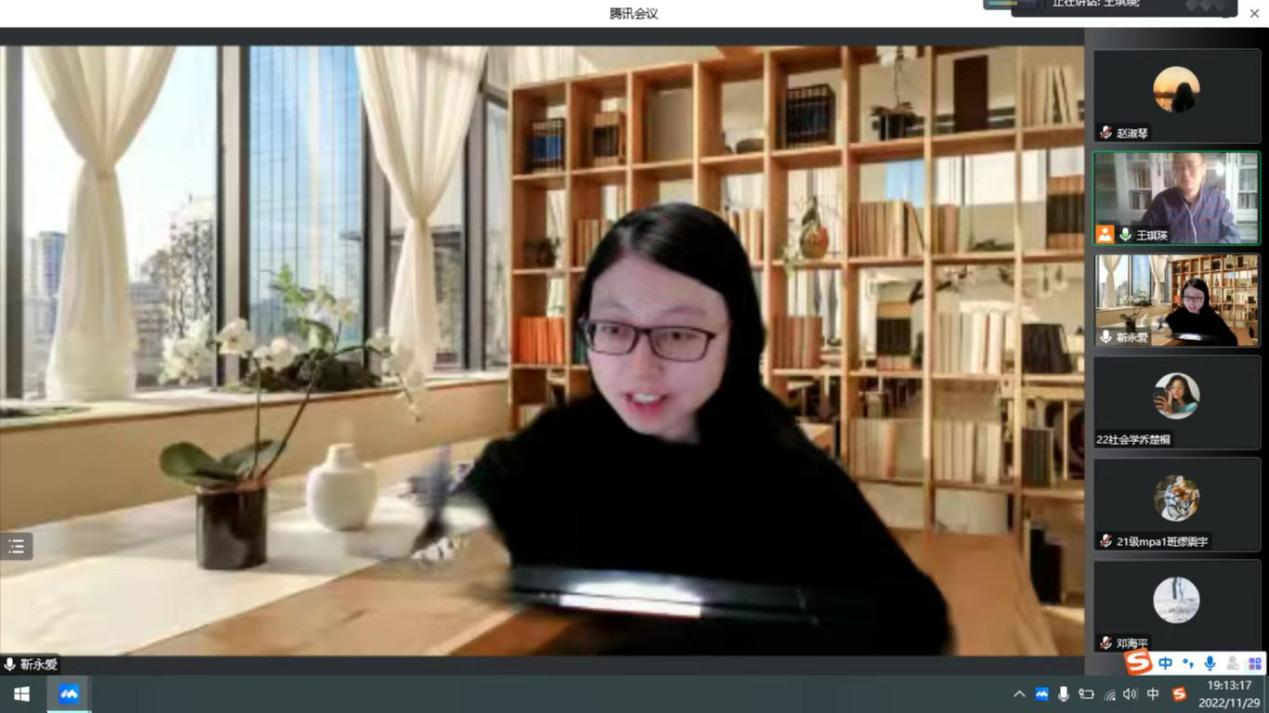 讲座尾声,靳永爱教授与斗鱼直播 师生进行了热烈地交流与讨论,并针对学院师生们提出的问题进行了认真回应。针对本次学术讲座,王琪瑛老师结合自己的体会进行了总结,认为靳老师的讲座是一次方法的“盛宴”,给同学们介绍了许多人口学领域的方法。在因果关系讨论中,王老师认为可以尝试利用主体建模法来确定因果关系。靳老师讲座中提到的现有老龄化研究中存在的问题及挑战,都是值得我们去深入挖掘的学术问题。最后,王老师针对这一系列讲座,提出一个供大家思考的问题:听讲座时,一定要认真体会专家是怎样思考问题的,问题的提出过程遵循“沙漏”的逻辑,鼓励大家要在讲座中既要学习不同学科领域的知识,还要学会提出问题的方式。