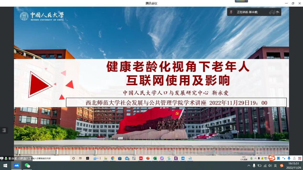 2022年11月29日19时,正值学校百廿校庆暨学院建院十周年院庆举行学术论坛系列学术讲座活动之际,应学院邀请,中国人民大学公共管理学院靳永爱教授莅临云端,在线为斗鱼直播 师生作了题为“健康老龄化视角下老年人互联网使用及影响”的学术讲座。本次讲座由王琪瑛老师主持,学院200多名师生参加了此次讲座。