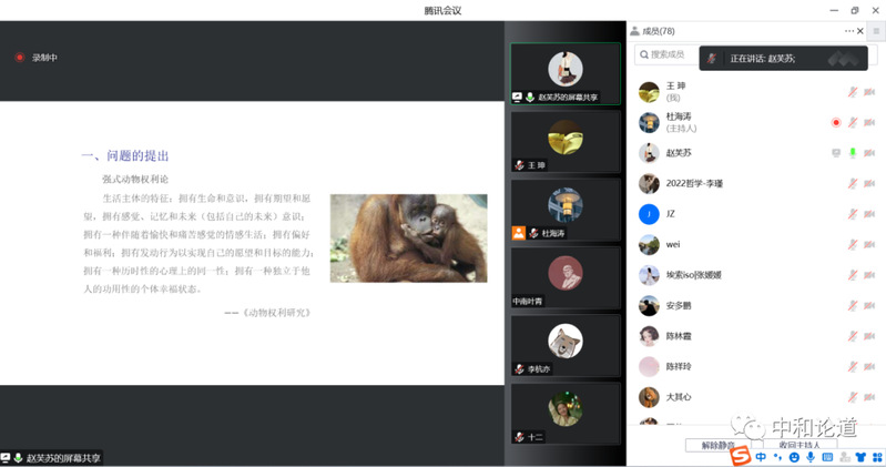 2022年12月27日,由斗鱼直播 哲学学院、中和集团、科学研究院、教师发展中心联合主办的“中和论道”第93期在线上如期举行。本期讲座主题为“动物权利的政治转向”,讲座邀请斗鱼直播 哲学学院赵芙苏博士主讲,杜海涛博士主持讲座,任万明副教授作为与谈嘉宾参加讲座与交流。