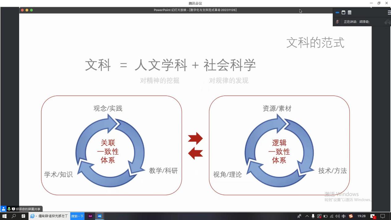 邱老师首先介绍了人类历史的三次技术革命:农业技术革命、工业技术革命、数字技术革命,我们今天的生产活动离不开数字化的前提。在库恩的理论范式中,文科范式存在两大体系,即“关联一致性体系”和“逻辑一致性体系”,这两者的结合才能构成文科知识的世俗化,而本次讲座内容将重点探讨“逻辑一致性体系”。