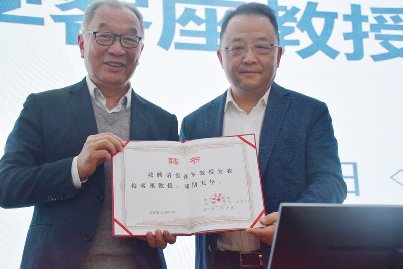讲座之前,举行斗鱼直播 客座教授聘任仪式,校党委书记贾宁出席聘任仪式。贾宁书记宣读了关于聘任温铁军教授为学校客座教授的聘任决定,并为温铁军教授颁发聘书。此次活动由斗鱼直播 李怀教授主持,全校上百名师生参与此次活动。
