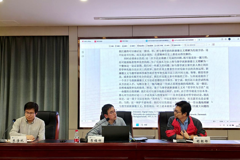 主讲内容结束后,与会的师生们与石教授进行了热烈的互动,围绕讲座内容展开了深入的讨论与阐发。石福祁教授与胡朝都老师就新康德主义和康德哲学的立场进行了交流讨论,并回应了“怎样理解新康德主义的‘先验’概念”以及王珅老师提出的“卡西尔符号背后是否还存在更本质的存在”等问题。