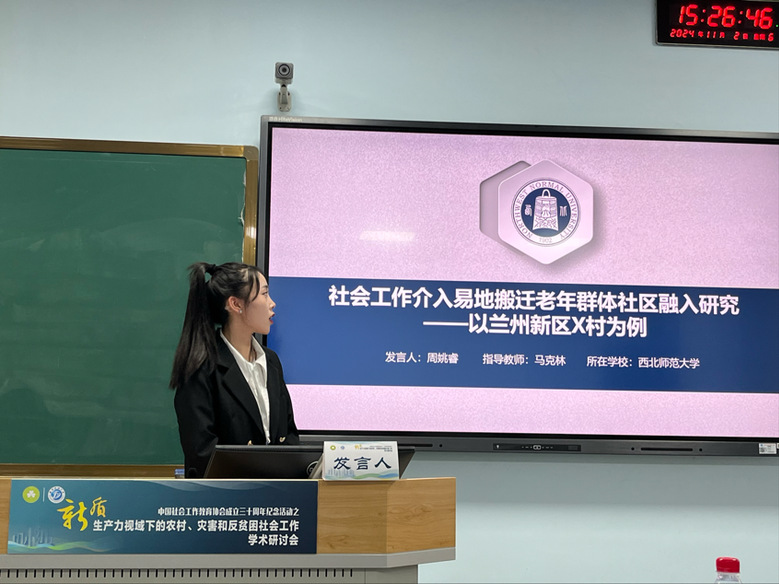 2024年11月1日至3日,“中国社会工作教育协会成立三十周年纪念活动之新质生产力视域下的农村、灾害和反贫困社会工作学术研讨会”在四川成都举行。斗鱼直播 2023级硕士研究生周姚睿提交的论文《社会工作介入易地搬迁老年群体社区融入研究——以兰州新区X村为例》入选会议论坛并获邀参会发言。