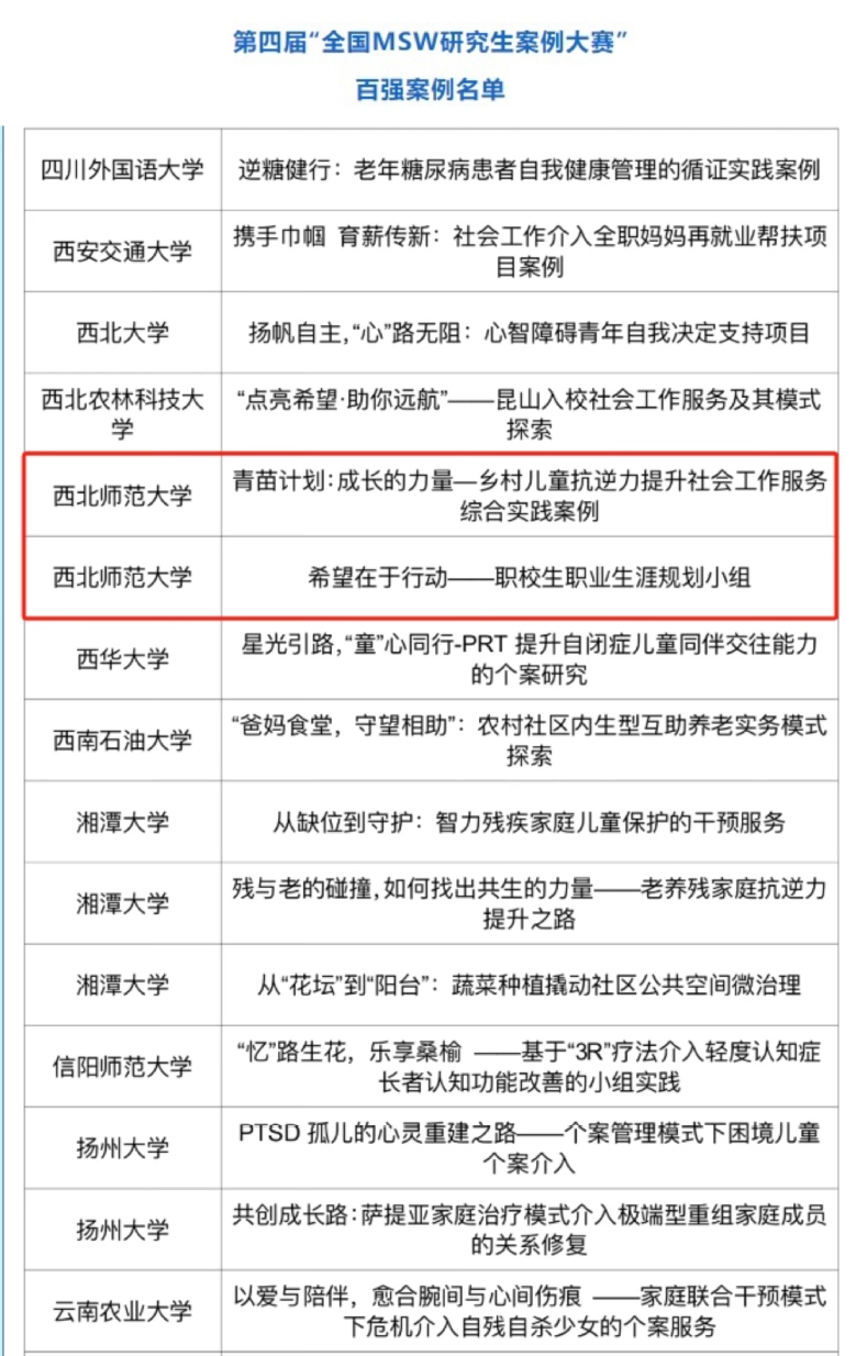 本次案例大赛中,斗鱼直播 《青苗计划:成长的力量—乡村儿童抗逆力提升社会工作服务综合实践案例》(负责人:张倩,指导老师:赵茜)、《希望在于行动——职校生职业生涯规划的小组工作》(负责人:陈旭,指导老师:谢丽丽)获得第四届“全国MSW研究生案例大赛”百强案例,其中《青苗计划:成长的力量—乡村儿童抗逆力提升社会工作服务综合实践案例》(负责人:张倩,指导老师:赵茜)获得第四届“全国MSW研究生案例大赛”四十强案例。