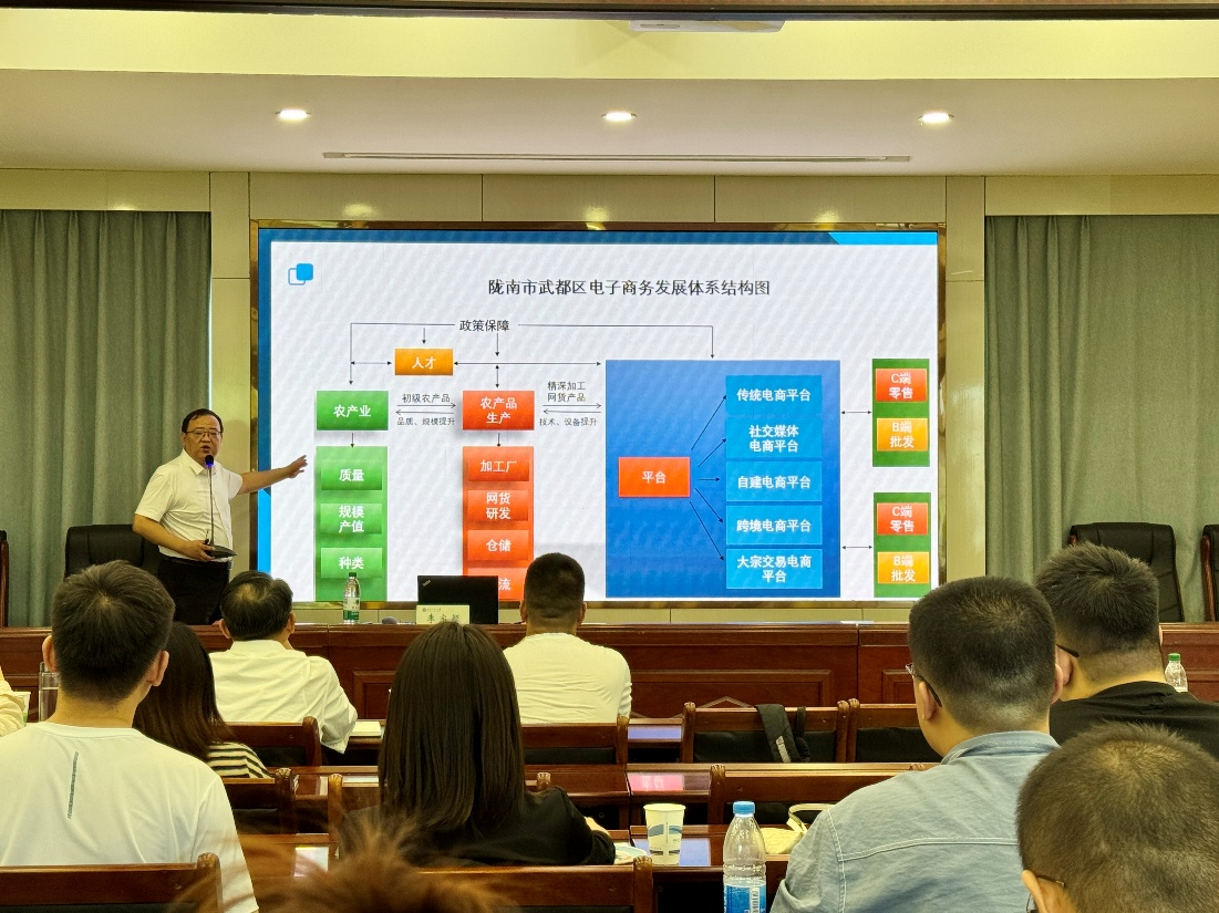 讲座伊始,李宗颖主任首先介绍了武都区在电商发展方面的坚实组织保障,同时详细阐述了发展县域电商几个基本概念以及国家电商发展的政策方向。随后,李宗颖主任详细阐述了武都区电商的发展现状与取得的显著成效。他通过一系列数据和案例,展示了武都区近年来在农产品销售、电商人才培养、电商平台建设等方面的积极探索和斐然成绩。特别是在推动特色农产品如花椒、橄榄油等通过电商渠道走出武都,拓宽农民增收致富路径方面,武都区的经验为其他县域提供了宝贵的借鉴。