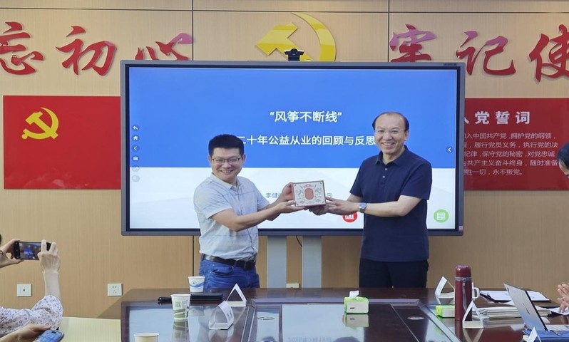 李怀老师和李勇进老师首先简要介绍了李健强主任,并为李健强主任颁发优秀校友的纪念品。随后,李健强主任以“风筝不断线”为主题,分享了自己20年的公益从业历程,回顾了职业发展中的关键选择、实践经验与感悟。