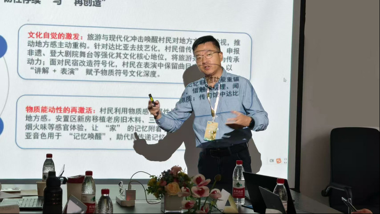 南京师范大学副教授黄旭的发言题目是《怒江峡谷村落地方感:对现代化、旅游和物质环境的新物质主义探究》,他以云南福贡县老姆登村和知子罗村为例,从新物质主义视角出发,运用扎根理论探讨现代化建设和旅游发展背景下少数民族地方感与日常器物的关系,揭示器物对地方感的作用机制。研究表明,日常器物不仅是地方感的载体,更作为能动主体,通过人类与人类互动推动了地方感的动态构建与持续变迁。中山大学博士研究生庄钧然、中央民族大学讲师区缵作为与谈人。庄钧然肯定了该论文的前瞻性及相关案例的启发并提出三点思考。其思考聚焦于器物变迁中深层文化结构的新载体、扎根理论下反常案例的研究空间,以及物的能动性与有效性的清晰界定。区缵从研究方法、概念化、案例解释路径提出问题,建议采用图表与理论建构,强调人类学需避免理论拼贴,应该让田野材料推动理论深化。