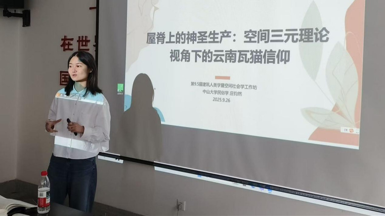 中山大学博士研究生庄钧然的发言题目是《屋脊上的神圣生产:云南瓦猫信仰的空间三元互动》,她基于云南鹤庆北班榜村的田野调查,运用“空间生产”的三元理论,探究传统民居屋脊兽“瓦猫”信仰的空间建构机制。聚焦瓦猫兼具建筑构件实用性与神圣象征的双重属性,研究揭示其信仰力量源于感知空间、构想空间与生活空间的动态互构。兰州大学哲学社会学院副教授刘宏涛、复旦大学副教授赵晓梅作为与谈人。刘宏涛强调民族志中事实部分的核心和恒定价值,指出讨论空间开放性时需关注当地人的多层空间观念。赵晓梅推荐使用哈维的关系空间理论作为后续研究的框架。
